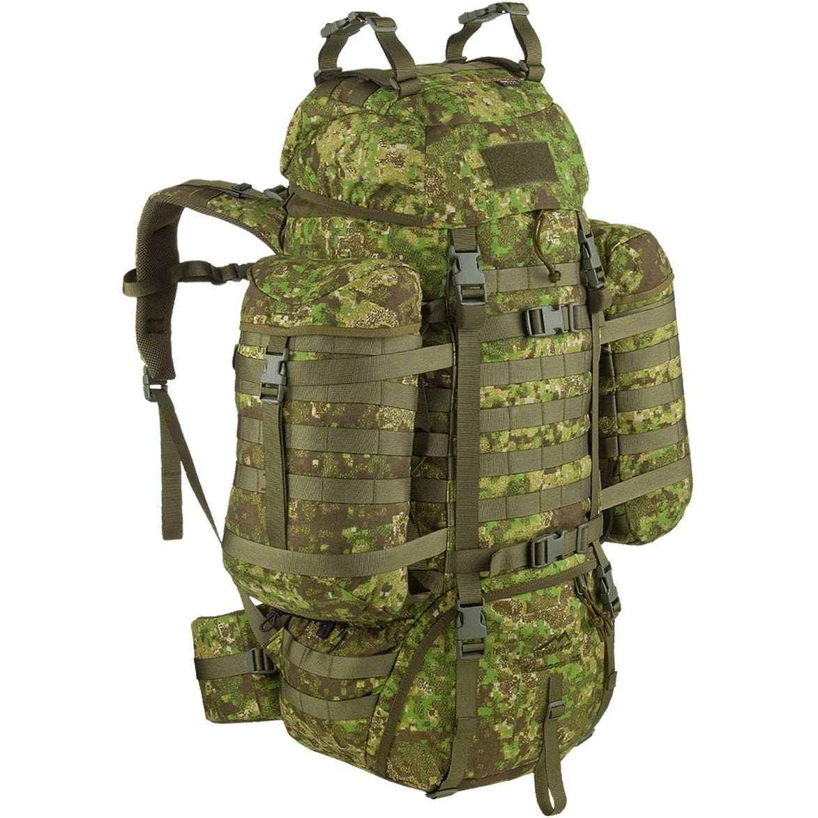 Front of the backpack, side panels and the lid has a multiple MOLLE